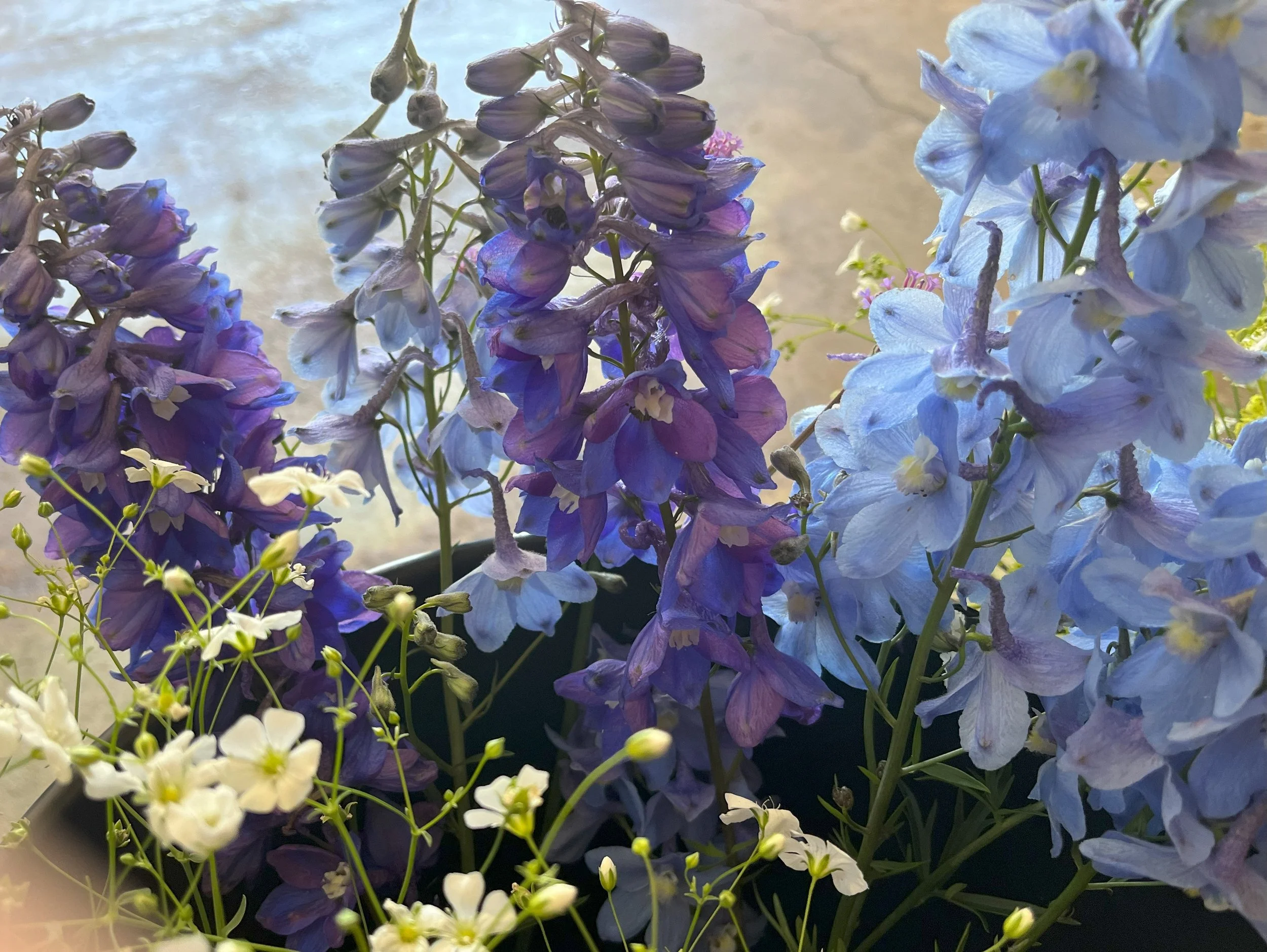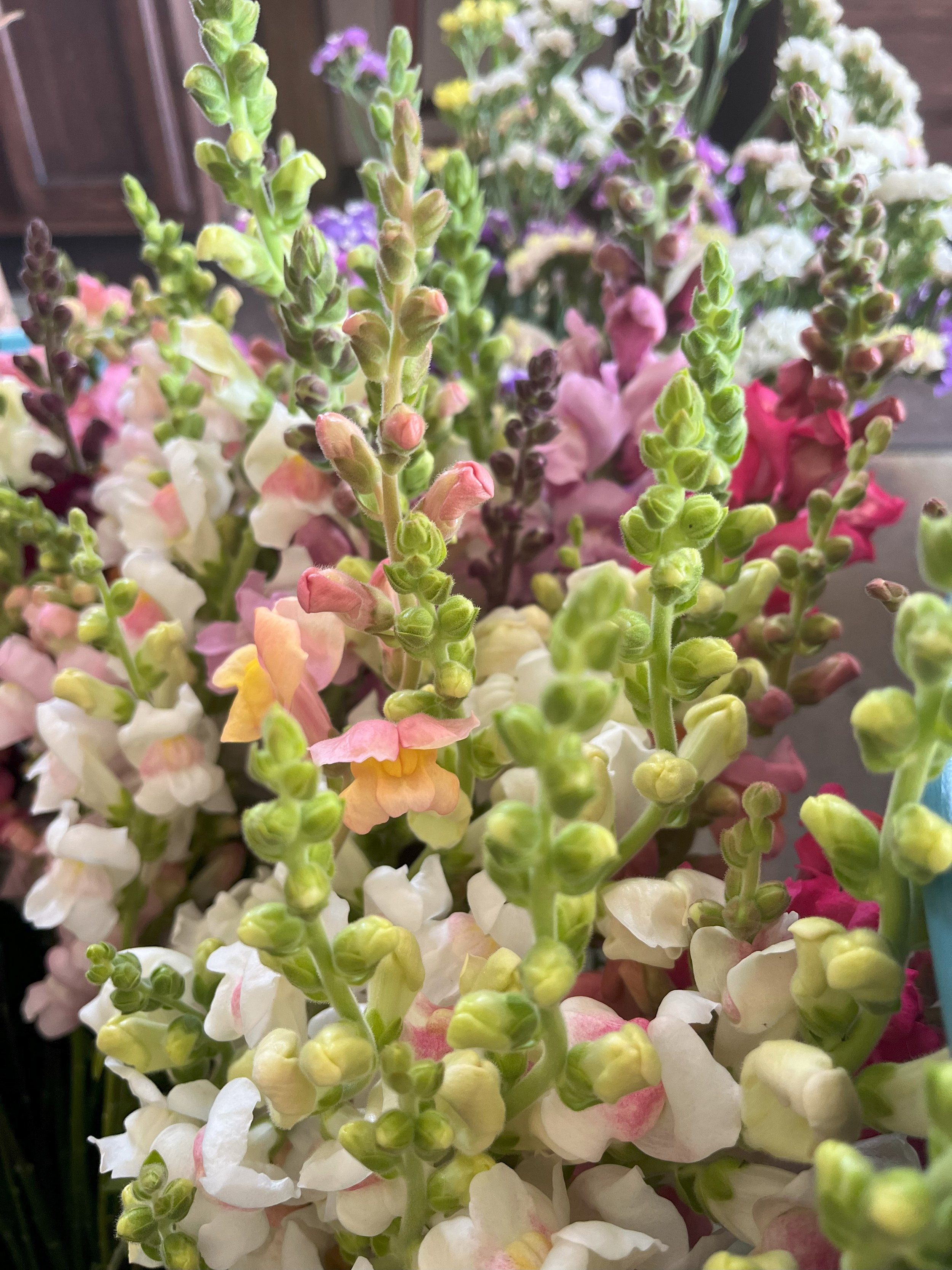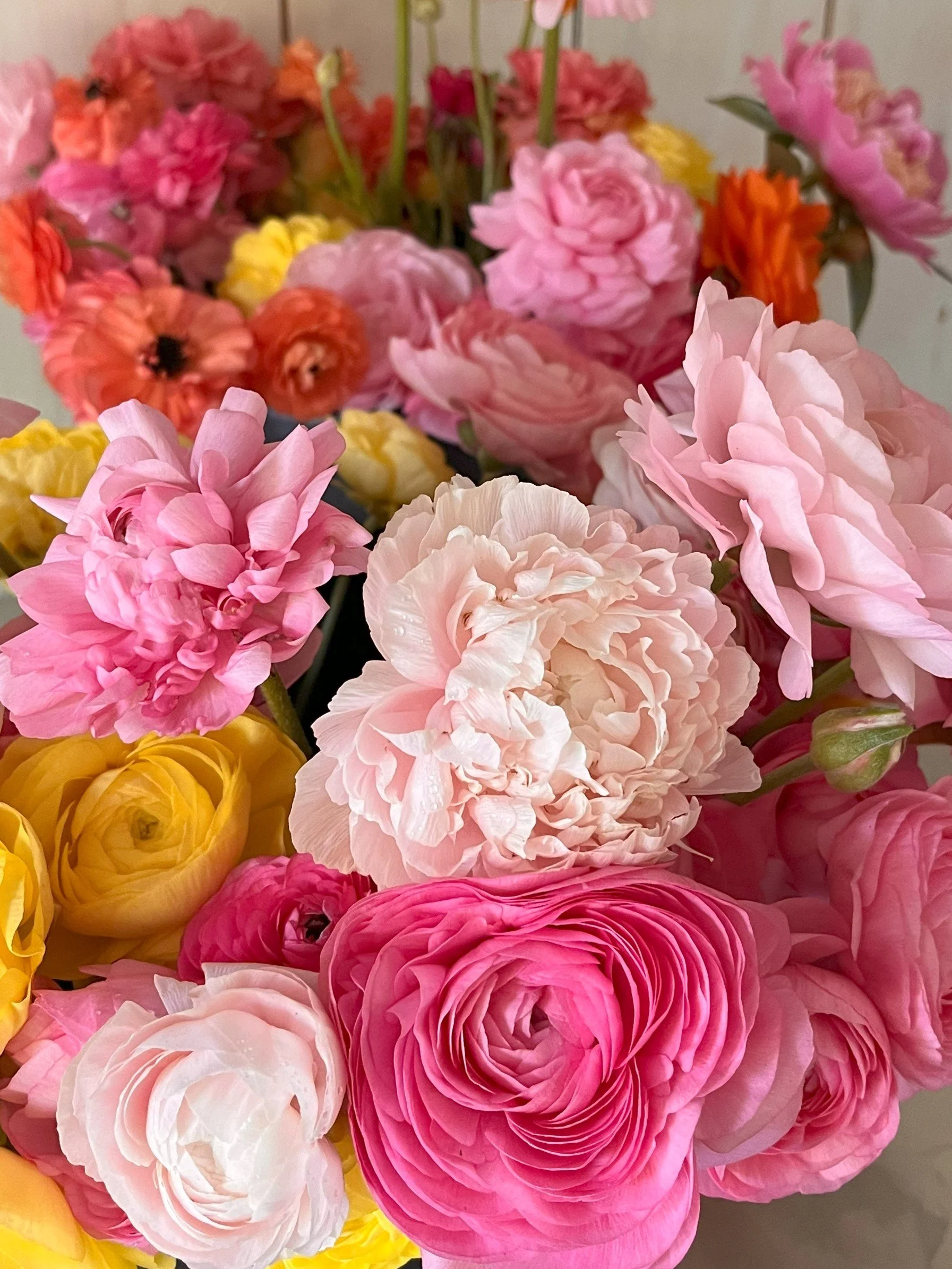 Starting at top left to right: Lisianthus (blush), Zinnia pastels mix, snap dragon mix, campanula (lilac), Ranunculus and Peonies (pinks), Delphinium (blues), Dahlia (Sweet Suzanne), Crazy Daisy, and Snow on the Mountain Euphorbia.